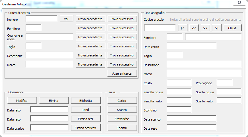 - ricerca articoli per barcode, codice, fornitore, descrizione, marca o campo libero (taglia, misura, tipologia...)
