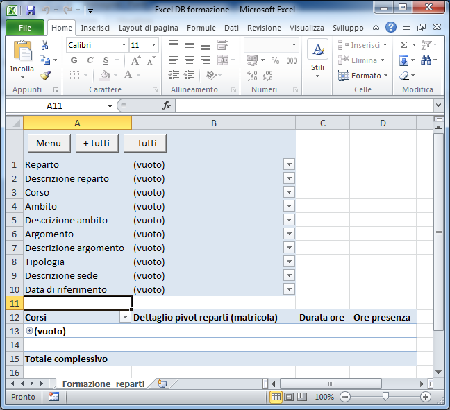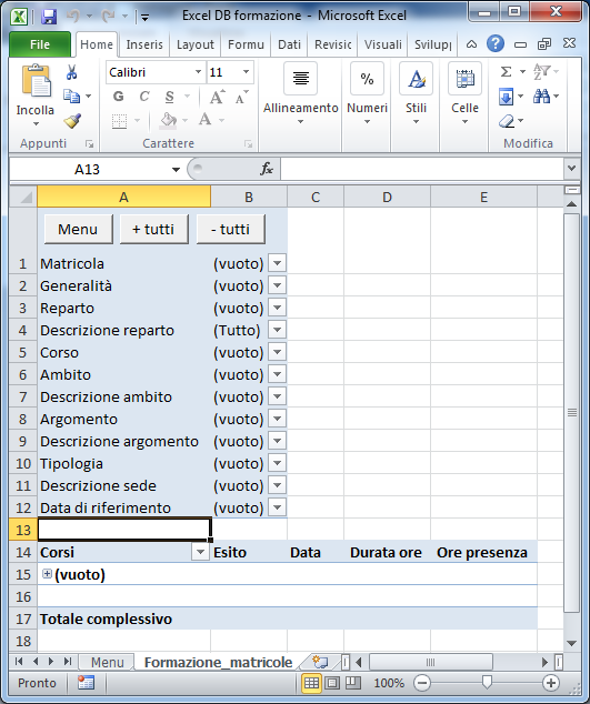 Ulteriori funzioni di excel db formazione:- gestisce fino a 1000 matricole suddivisibili in 100 reparti, 20 ruoli e 200 mansioni